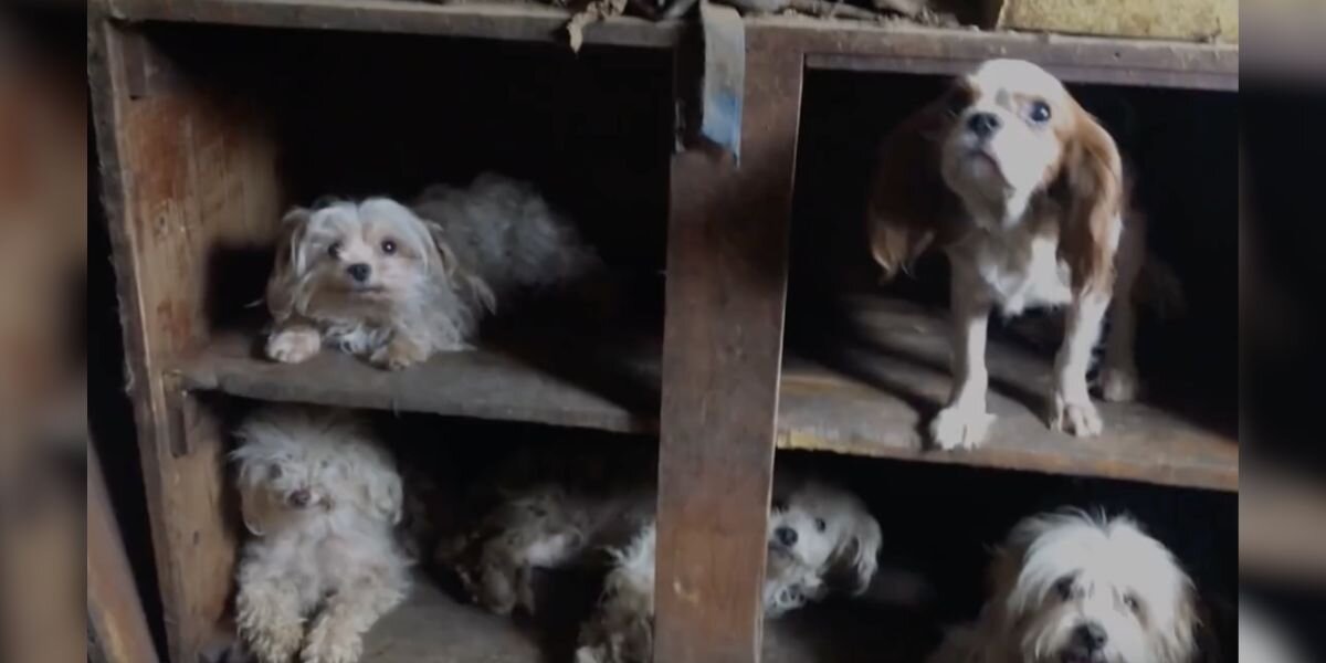 現場に入ると、なんと 100匹以上の動物たちが狭い場所に押し込まれて いました。埃まみれの中、猫や犬が詰め込まれたケージが入口に無造作に積まれ、キッチンでは子犬たちが棚の中に隠れて震えていました。