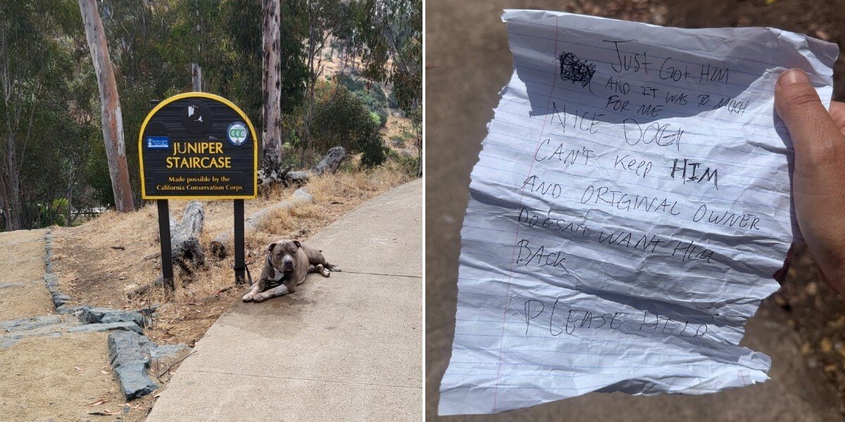 エリカさんは急いでバルボアパークへ向かい、そこで見つけたのは、フェンスに結びつけられたグレーのピットブルでした。近づくと、犬の横には前の飼い主からの悲しいメッセージが書かれた紙がありました。