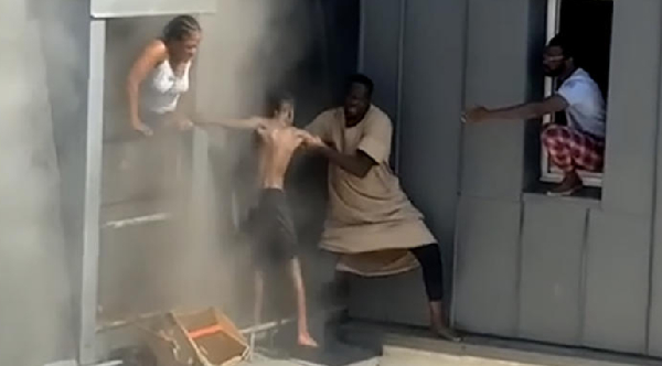隣の窓を覗くと、煙が充満しているアパートが見えました。中には女性と子供たちが閉じ込められていました。そこから、 **フセイヌはためらうことなく6階のledgesに飛び出しました**。🔥