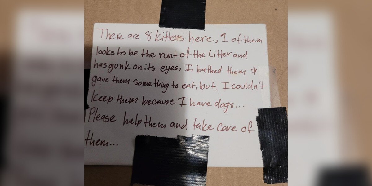 驚くことに、彼女が見つけたのは、自分の車のそばにあるテープでしっかりと閉じられた箱でした。上には、「子猫が生まれたけれど、犬を飼っているので飼えない」と書かれたメモが置いてありました。残念ながら、Room 8 Memorial Cat Foundationの周りでは、子猫が捨てられるのはよくあること。でも、やっぱり深夜にそれを見つけるのはとても驚きでした。