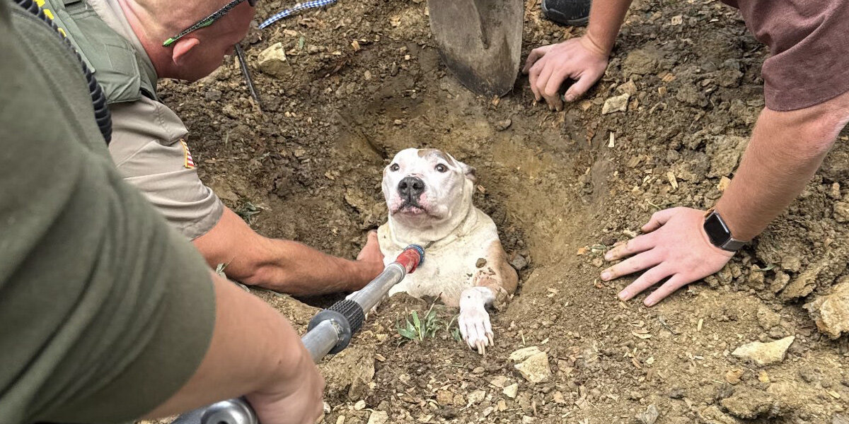 幸運にも、助けてくれた人たちが穴を広げて、ブルーザーを 安全に持ち上げる ことができました👏。「彼が落ちてから出るまで、約1時間半かかった」とニコールさんは言います。