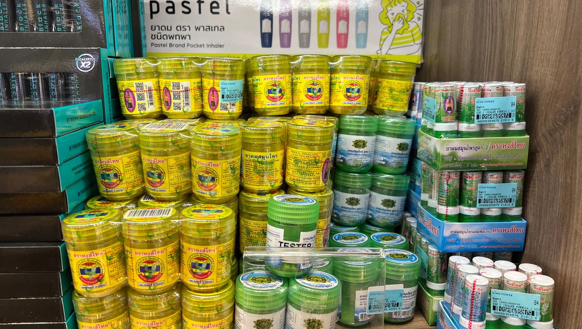 これは全然怪しいものじゃなくて、タイの保健省が認めているお薬の一つなんだ。意味は、タイ語で「ヤ」はお薬、「ドム」は嗅ぐことを意味しているよ!🩺✨
