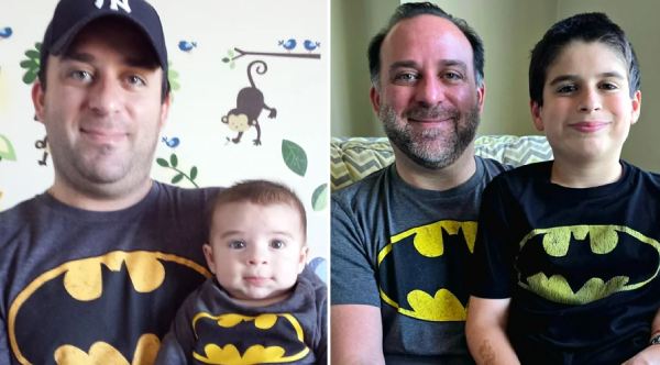 11年前、ニックさんの息子が生まれたとき、初めてお揃いのバットマンTシャツを着て写真を撮ったんだ。それが、彼らの毎年の行事になったの。