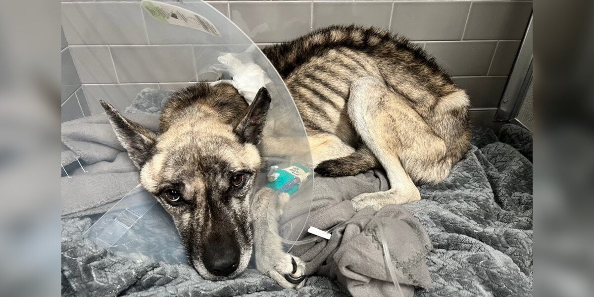 この骨と皮のようなピットブルとハスキーのミックスは、なんと体重が18ポンド(約8kg)しかなく、健康な状態であるはずの40ポンド(約18kg)以上も足りない状態でした。