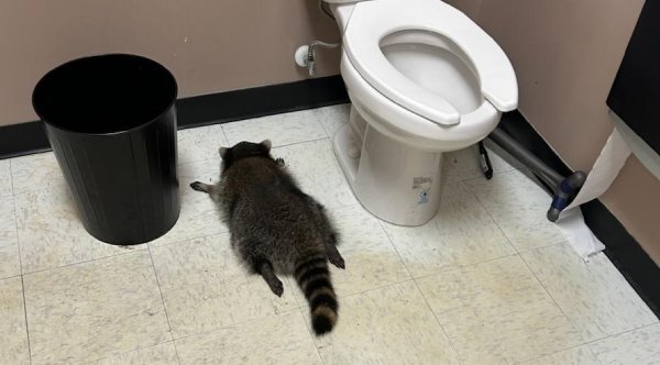 そう、タヌキがトイレで爆睡中。どうやら、ABCストア史上最も wildな独りパーティーを開催していたみたい!