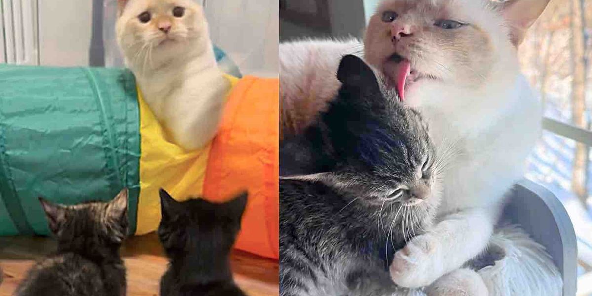 子猫たちの元気な鳴き声は、先住猫のベアとボディの注意を引きました。彼らはすでにたくさんの子猫の世話をしていて、遊び方や猫社会のルールを教えるプロなんです。