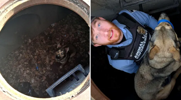 彼女は迷わず、動物の法律執行機関に助けを求めました。その後、コーポラル・ローリンがすぐに現場に到着しました。彼は状況を確認しましたが、溝は狭くて直接入ることは難しそうでした。そこで、近くにあるマンホールの蓋に気付き、開けてみることにしました。