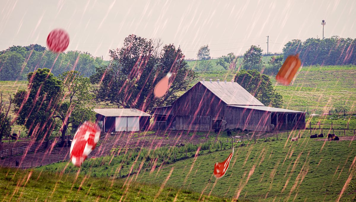 事件の舞台はケンタッキー州バス郡のオリンピアンスプリングス近くのクラウチ家の農場。この現象は、まるで大きな雪のように、降る肉が目を引いたんです。大きなものは4インチ四方ほどもあったとのことだけど、ほとんどは小さくて薄いものでした。