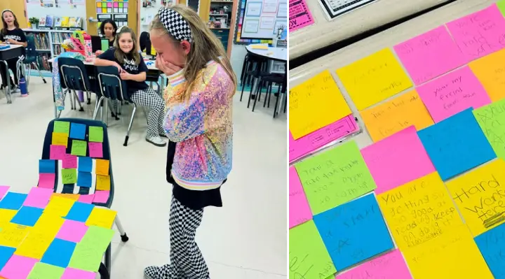 Joanneはこう書いているよ:「これは100%彼らのアイデアだったの。別の生徒が提案して、みんながそのアイデアに乗ってくれたの。彼女が教室にいない間に、彼女のデスクと椅子をポストイットでいっぱいにして、優しさや彼女への思いを伝えたの。」