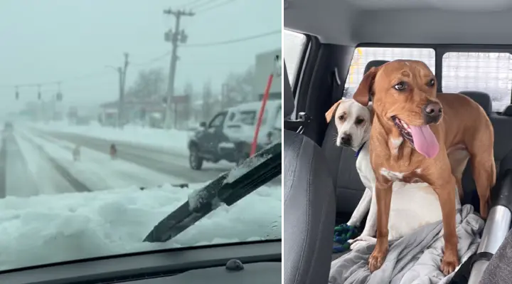 公衆事業部の従業員、ケニー・マクゴワンさんは、バビロンのタウンホール近くで道路を除雪しているときに、何かおかしなものを見つけました。猛吹雪の中、彼は忙しい道路を走る2匹の犬を発見したのです。
