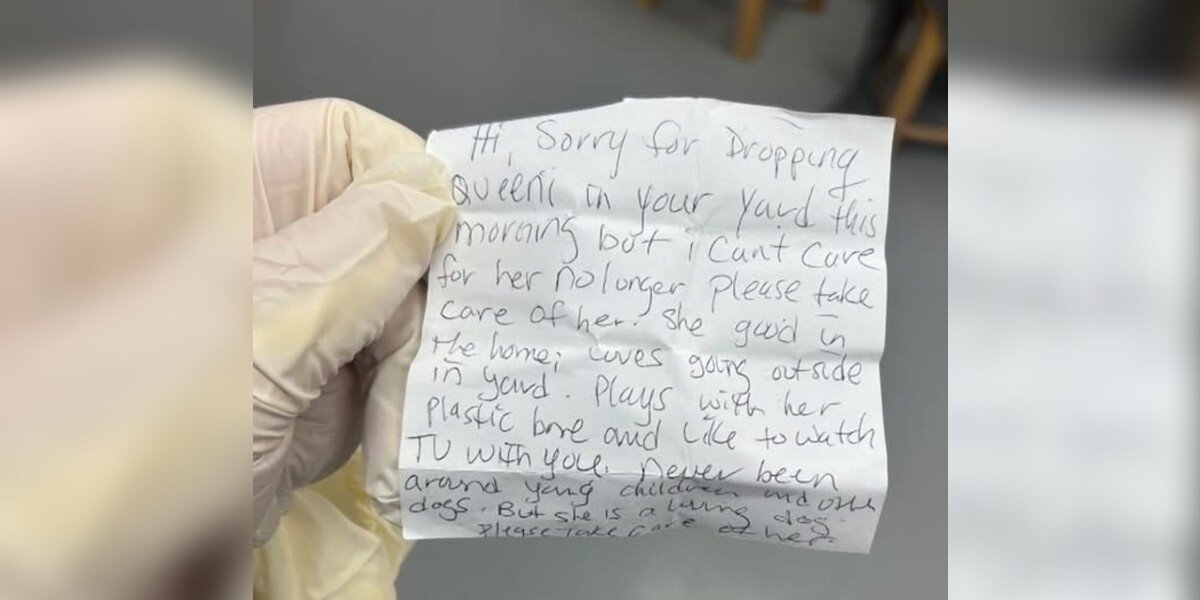「こんにちは、今朝クイーニをあなたたちの庭に置いてしまってごめんなさい。もう彼女の面倒が見れないんです。どうか彼女を大切にしてあげてください。クイーニはお家の中でも良い子で、外に出るのが好きです。プラスチックの骨で遊んだり、一緒にテレビを見るのも好きです。小さい子供や他の犬と接したことはありません。でも、彼女は愛情深い子です。どうか彼女をお願いします。」