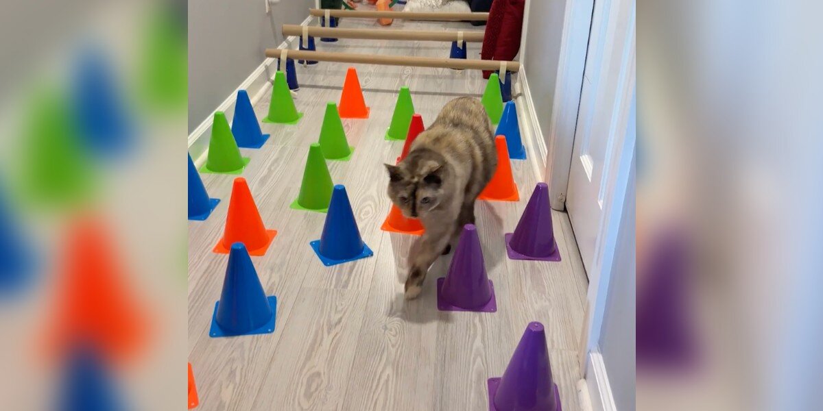 時が経つにつれて、ペイトンさんはもっと複雑な障害物コースを作るようになりました。夏の間は、チェスターベルは家のプールで泳ぎながら運動することも!🏊‍♀️ でも、寒くなると室内での運動に切り替えました。