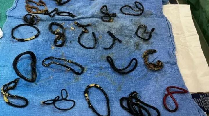 手術中に獣医たちはMidniteの閉塞の原因を発見しました。それはなんと、**毛ゴムが26本も!**😱